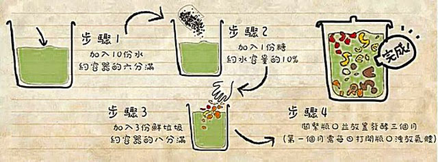 材料:水、鲜垃圾(蔬菜叶、水果皮等),糖(黑糖、黄糖或糖蜜)