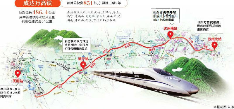 中国铁路成都局集团有限公司相关负责人介绍,成达万高铁是我国“八纵八横”高速铁路网沿江通道的重要组成部分,为国家Ⅰ级双线铁路,线路全长486.4公里,新建正线桥梁长200.7公里,隧道长124.9公里,桥隧总长325.6公里,占新建线路长度的75.3%。全线设计时速350公里,设13座车站,途经天府国际机场,配套建设天府动车所,项目建设工期5年。