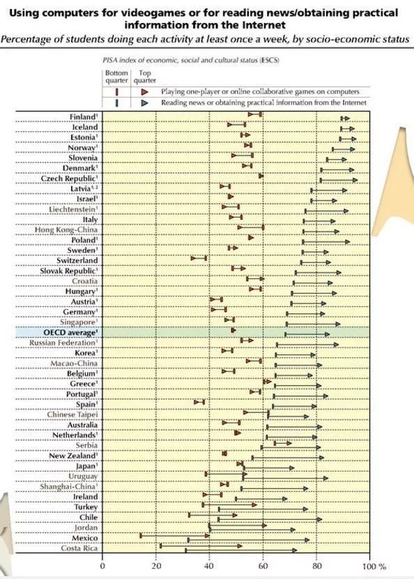 2016年,经合组织(OECD)对40个国家的青少年的屏幕使用时间进行了调研,结果发现:贫困家庭的青少年更有可能用电子产品来打游戏,而富裕家庭的青少年则更有可能用它们搜寻信息,或阅读新闻,而不是用来纯娱乐。